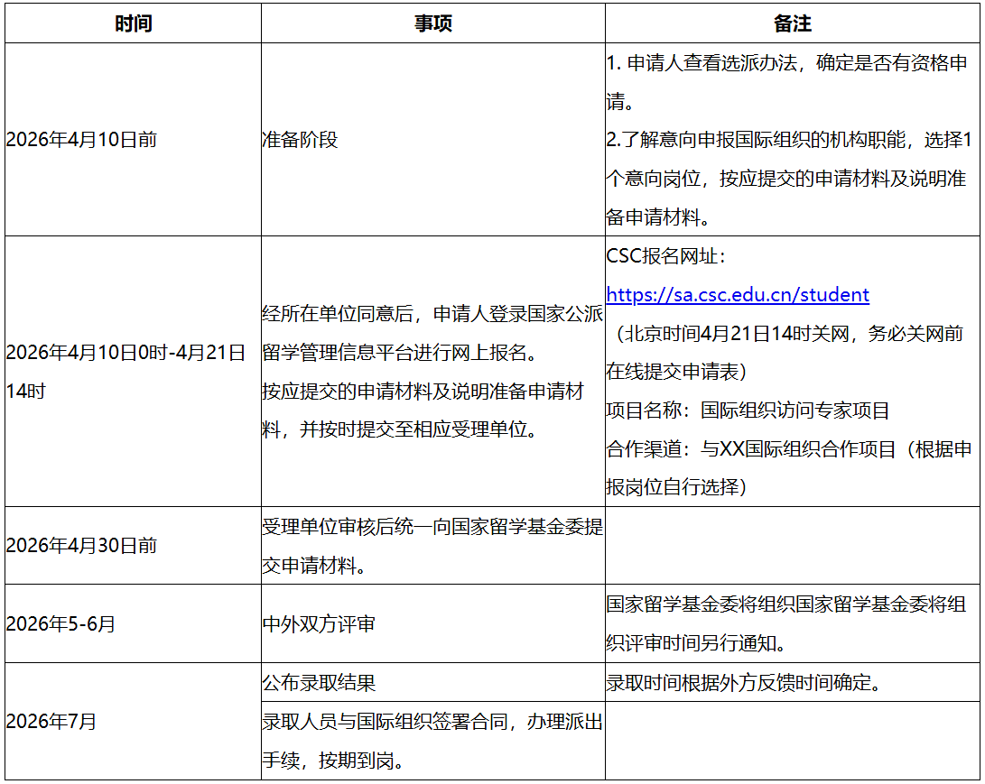 申请人须于2026年4月10日0时-4月21日14时登录“国家公派留学管理信息平台”(https://sa.csc.edu.cn/student)进行网上报名,并按要求上传申请材料。受理单位请于2026年4月30日前通过信息平台提交推荐公函、初选名单和申请人电子材料至国家留学基金委。项目申报人请于4月21日14:00前将相关纸质材料提交至国际合作处(主楼803),逾期将不予受理。我处将按留学基金委及教育厅的要求统一为申请人办理推荐公函,并将相关材料报送至教育厅审核。