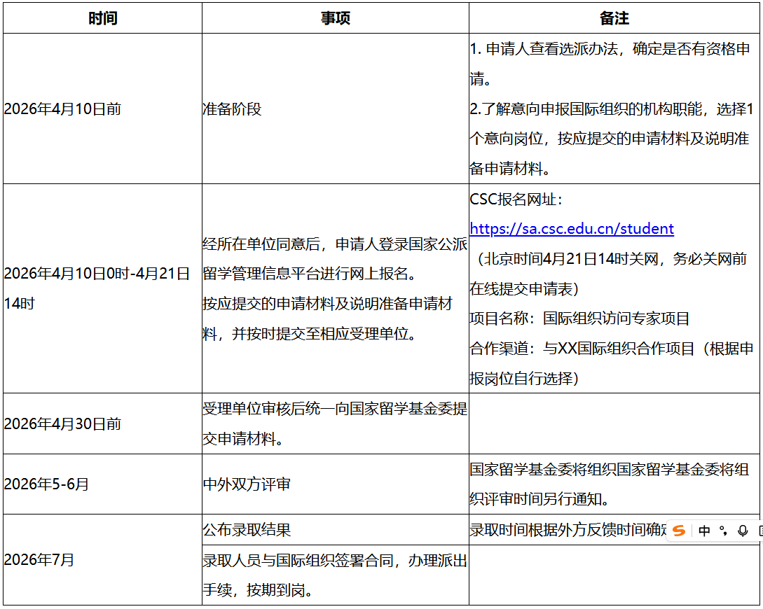 申请人须于2026年4月10日0时-4月21日14时登录“国家公派留学管理信息平台”(https://sa.csc.edu.cn/student)进行网上报名,并按要求上传申请材料。受理单位请于2026年4月30日前通过信息平台提交推荐公函、初选名单和申请人电子材料至国家留学基金委。项目申报人请于4月21日14:00前将相关纸质材料提交至国际合作处(主楼803),逾期将不予受理。我处将按留学基金委及教育厅的要求统一为申请人办理推荐公函,并将相关材料报送至教育厅审核。